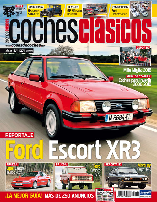 En Portada: Ford Escort XR3. El pionero en versiones deportivas de la tercera generación del Escort. Probamos un Ford Bronco, concebido tanto para ir a esquiar como para hacer la compra, y un Opel Calibra Turbo 4x4. Os contamos todo sobre el Mercury Capri JPS europeo que fue exportado a EE.UU. y probamos un Hispano-Suiza H6, el buque insignia de la marca española. La Guía de Compra trae los vehículos más interesantes de los años 2000 para invertir y la Competición trata el programa Ford Total Performance. Motores Míticos recoge la historia del Ford V8.