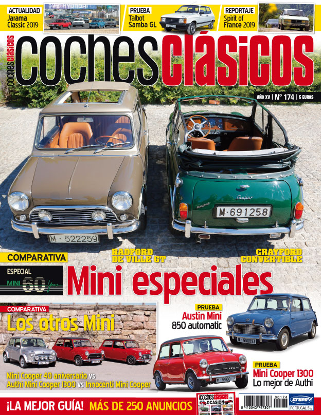 Especial 60 años de Mini. Radford de Ville GT Vs Crayford Convertible: Mini especiales en nuestra comparativa. Los otros Mini: Mini Cooper 40 aniversario Vs. Authi Mini Cooper 1300 Vs. Innocenti Mini Cooper. Probamos el Austin Mini 850 automatic y el Mini Cooper 1300, lo mejor de Authi. Además, probamos el Talbot Samba GL, visitamos Jarama Classic 2019 y Spirit Of France 2019.