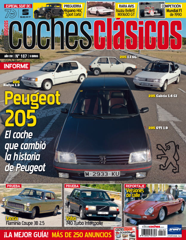 Informe: Peugeot 205, el coche que cambió la historia de Peugeot (205 Rallye 1.3, 1.1 GL, Cabrio 1.4 CJ, GTI 1.9). Probamos el Lancia Flaminia Coupe 3B 2.5 y el Volvo 740 Turbo Intercooler. Reportaje: Versiones de calle, coches de carreras adaptados para uso rutero. Preguerra: Hispano H6C “Sport Corto”. Rara avis: Isuzu Bellett MX1600 GT. Competición: Mundial F1 de 1990. 70 años de SEAT: SEAT Toledo, el 1º dentro del Grupo Volkswagen.