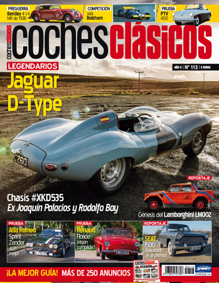 En Portada: Un mes más, un automóvil de especial relevancia histórica en nuestro país protagoniza la portada de COCHES CLÁSICOS, nada menos que el Jaguar D-Type que pilotaron en su momento Joaquín Palacio y Rodolfo Bay, y que ha recibido los colores y matrícula que ya portara en su época. El elenco de pruebas que podrás disfrutar en este número incluye modelos tan dispares como el Renault Floride, el Alfa Romeo Sprint, un fabuloso Bentley 4 ¼ y el prototipo PTV 400 que nunca llegó a ser comercializado. También contamos con un precioso reportaje sobre un SEAT 1500 ‘monofaro’ rescatado de la prensa por la familia Sánchez. David Rodríguez nos descubre toda la historia y peripecias detrás del nacimiento del Lamborghini LM002, cuyos bastidores y carrocerías se montaron en España, en Carrocería Irizar. Nuestra sección de Competición rinde un merecido tributo al tricampeón mundial Jack Brabham. No los olvidamos de la actualidad y todos los rallyes y concentraciones que han tenido lugar durante el último mes, incluyendo el Jarama Vintage Festival celebrado en el circuito madrileño. Contamos igualmente con nuestras secciones habituales, sin olvidarnos de la dedicada a las subastas.