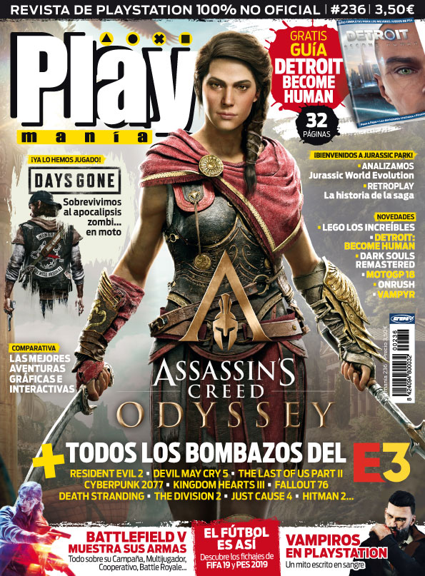 Assassins Creed Odyssey y todos los bombazos del E3: Resident Evil 2, Devil May Cry 5, The Last Of Us Part II, Cyberpunk 2077, Kingdom Hearts III, Fallout 76, Death Stranding, The Division 2, Just Cause 4, Hitman 2... Analizamos Jurassic World Evolution y repasamos la historia de la saga. Days Gone: Sobrevivimos al apocalipsis zombi... en moto. Battlefield V muestra sus armas. Vampiros en PlayStation, un mito escrito en sangre. Novedades: Lego Los Increíbles, Dark Souls Remastered, MotoGP 18, Onrush, Vampyr... Los fichajes de FIFA 19 y PES 2019. Y gratis, una guía de Detroit Become Human.