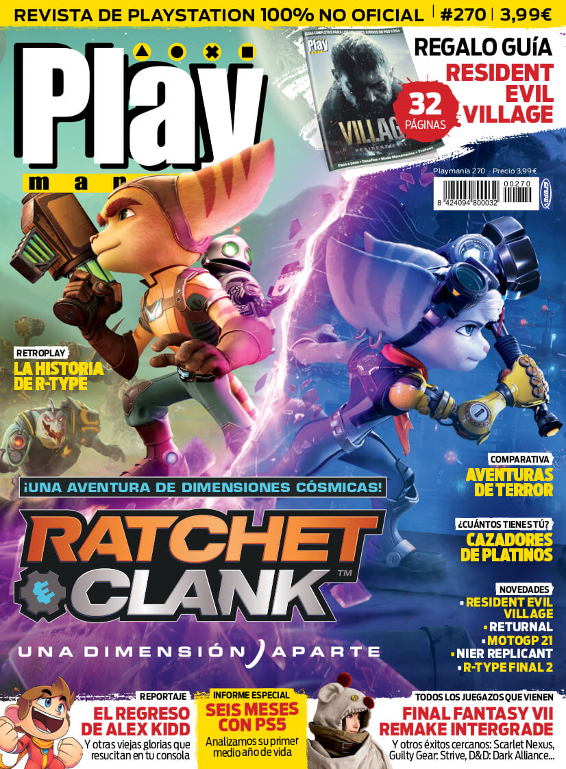 En PlayManía 270 te lo contamos todo acerca de Ratchet & Clank: Una Dimensión Aparte, el exclusivo de PS5 que mejor explota la potencia de la consola hasta el momento. Ponemos a los mejores juegos de terror frente a Resident Evil Village en nuestra Comparativa. Además, analizamos los 6 primeros meses de vida de PS5, con sus luces y sombras. R-Type ocupa nuestra sección Retro. Y por supuesto, todas las novedades para PS5 y PS4 y espectaculares avances como el de FFVII REmake Integrade. Y la guía de Resident Evil Village en formato especial para que la guardes con el juego.